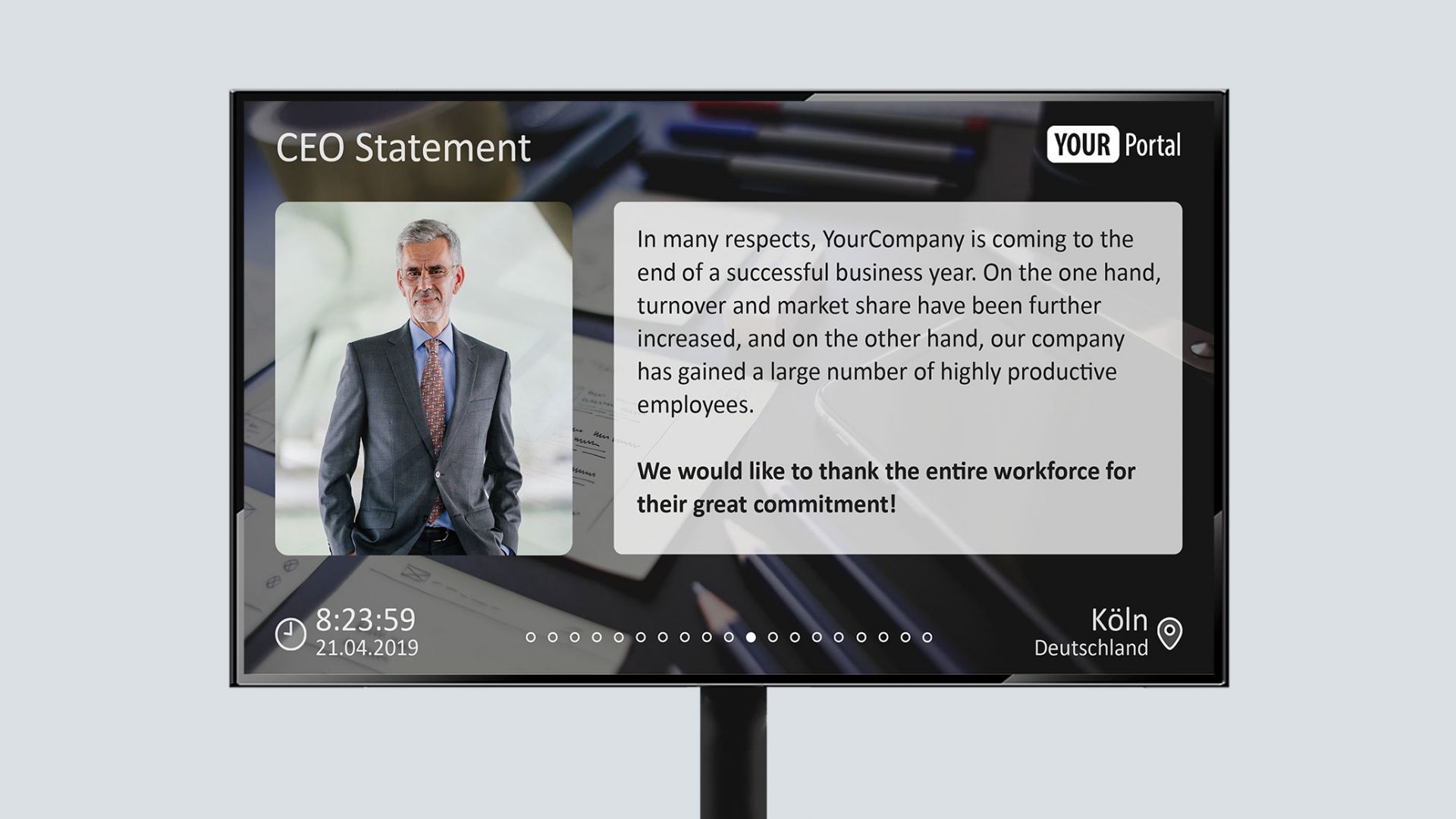 Our new product "VANTAiO Enterprise TV Display" enables the output of company news on standard TV sets. The SAP Enterprise Portal or the SAP Cloud Platform serves as data source. The aim is to increase the reach of communication within the company and to provide all employees worldwide with important news. Articles and content are maintained either in the SAP portal or in the SAP Fiori Launchpad; there is no further maintenance effort for output on TV sets. Our latest module satisfies both the information requirements and the design demands of a modern company.