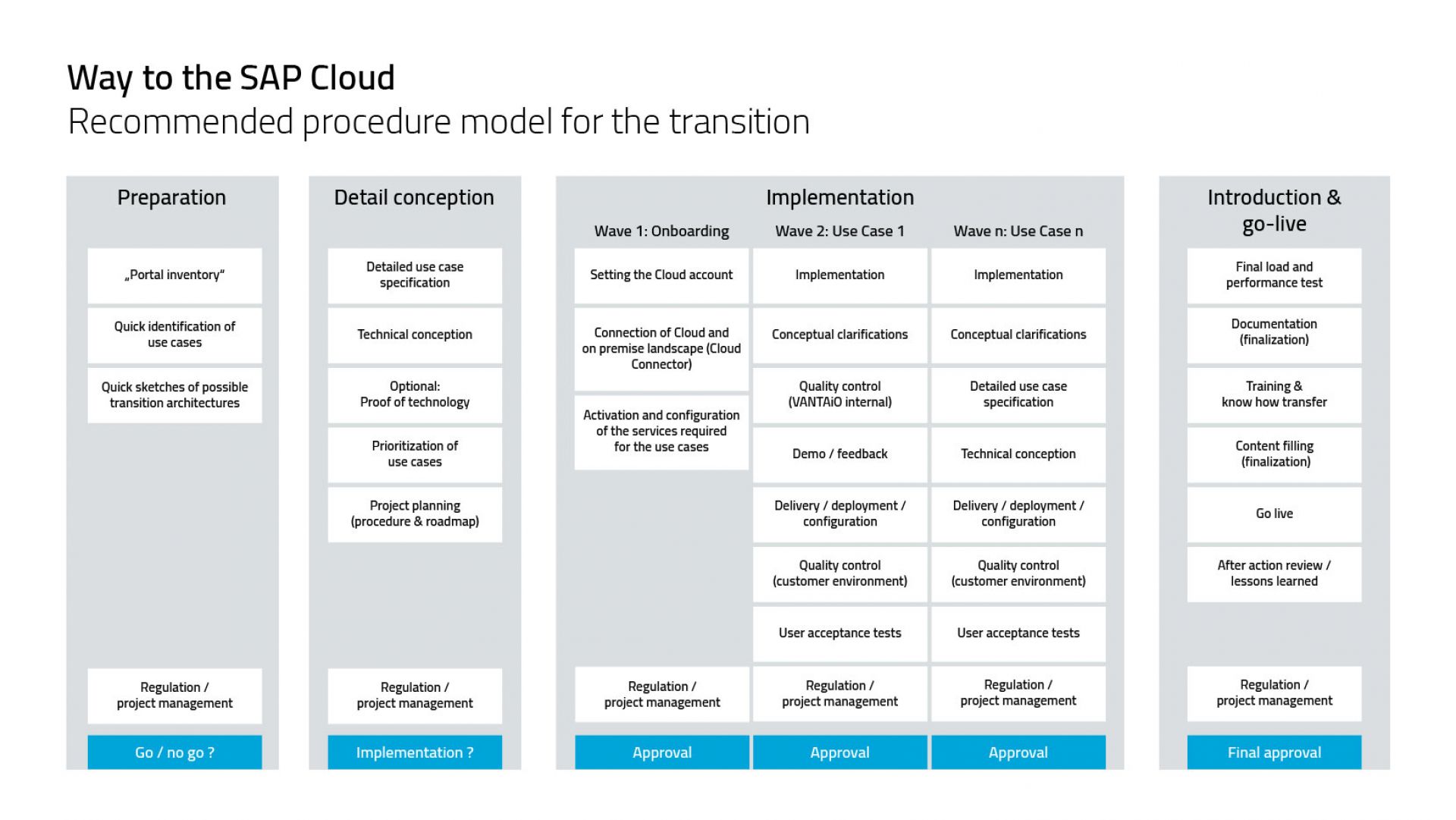Based on the proven VANTAiO portal project procedure model, we have developed a template/schema for the EP to CP transition. It consists of the following phases: Preparation, detailed conception, implementation (divided into waves/sprints) as well as introduction and go-live: