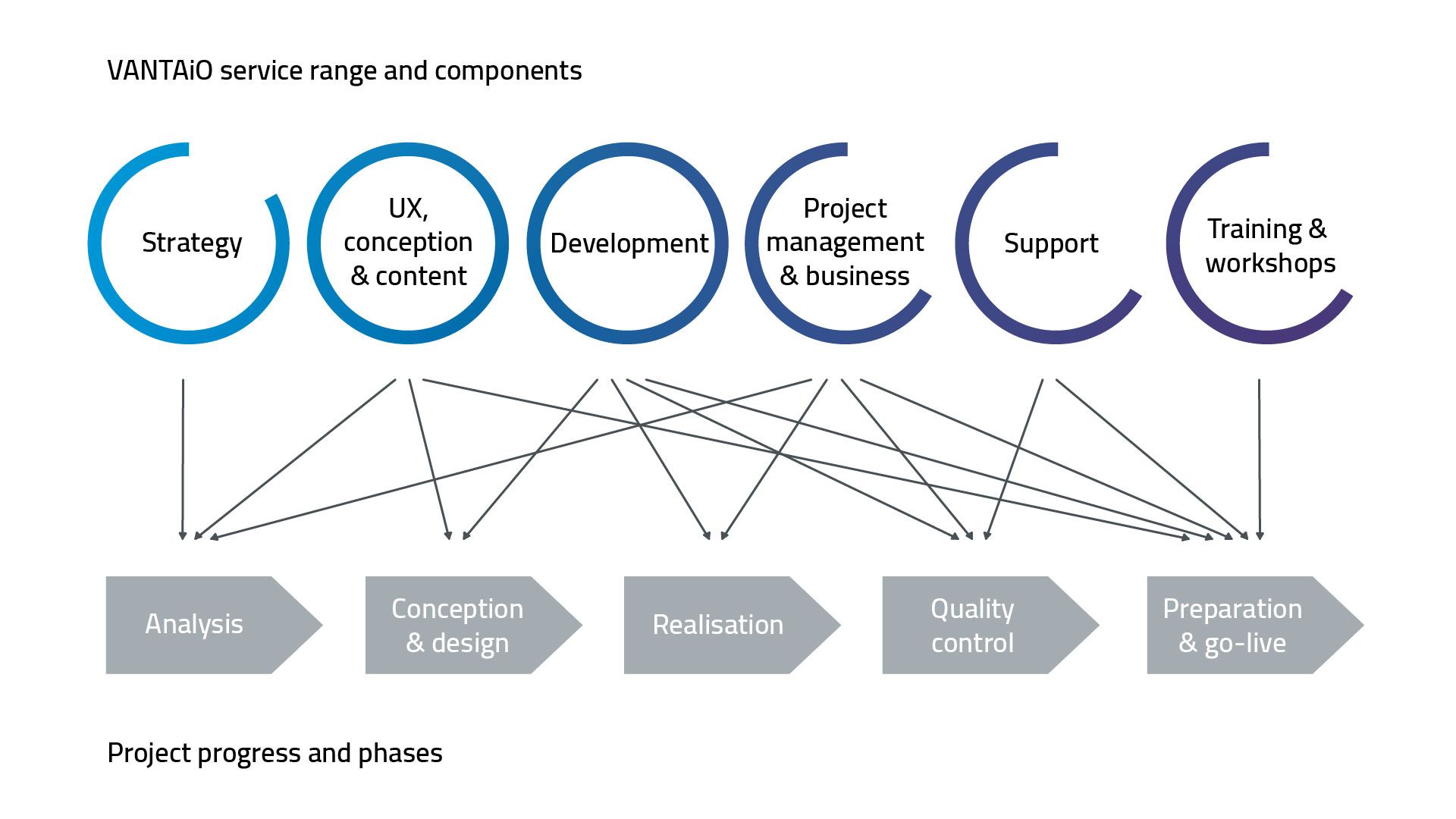What could be more logical than to apply this idea to the project procedure for a portal launch? The individual categories result from the VANTAiO service areas. In each of these areas we have a tried and tested set of methods and tools at our disposal in order to work out the resulting activities efficiently and purposefully.