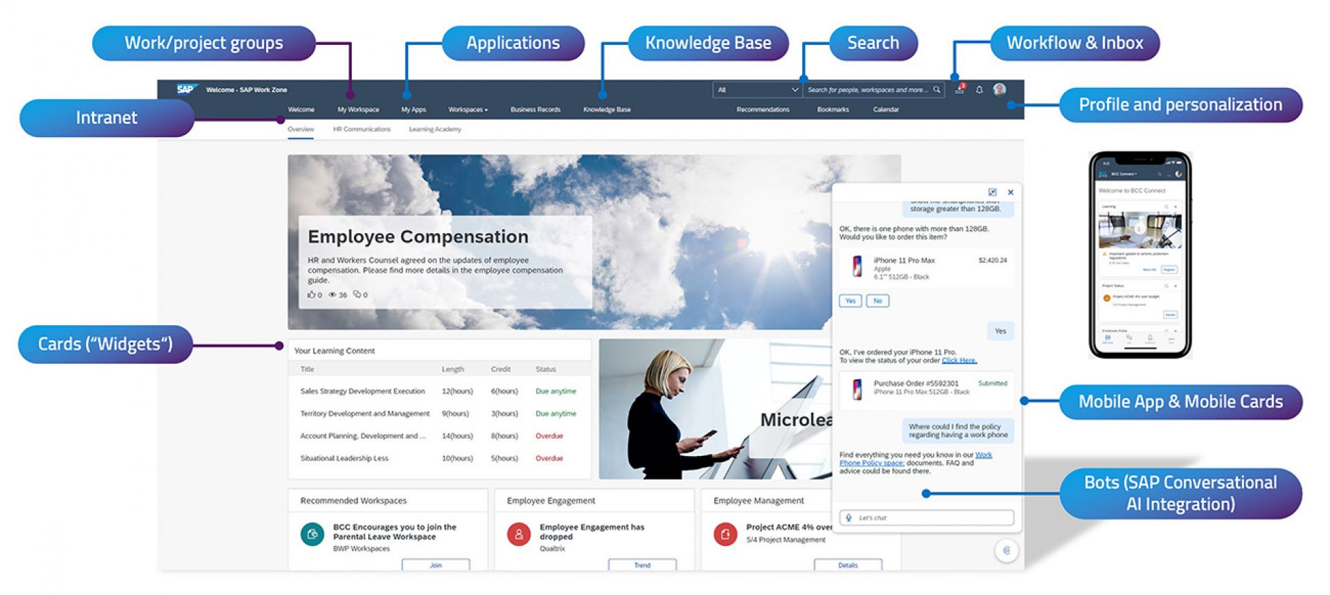 The illustration shows the anatomy of the SAP Work Zone. The system has a modular structure and can therefore be quickly and easily adapted to requirements by editors. In addition, the SAP Work Zone can be used from a classic laptop or desktop PC as well as from mobile devices such as smartphones. There is a native app for smartphones.