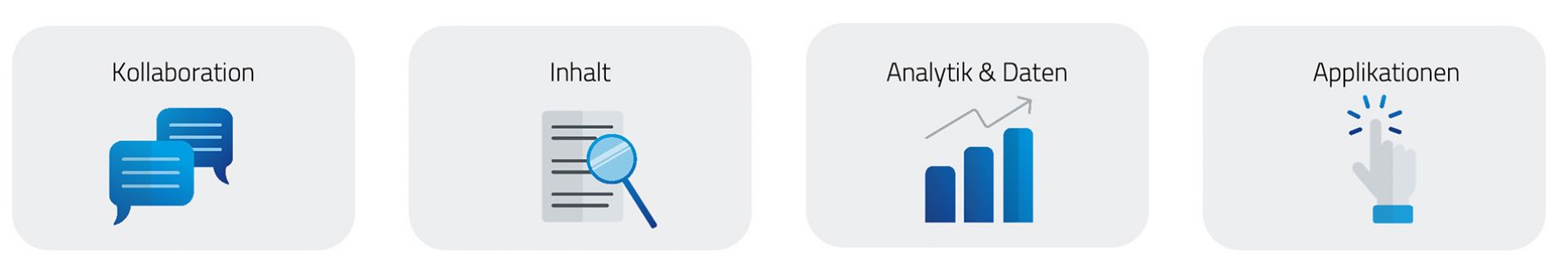 The tight connection of the areas of collaboration, content, data and applications results in cross-area use cases and possibilities. Typical examples in practice are general communication and cooperation in teams and projects within the company and with partners, onboarding processes with process integration, e.g. for ordering work equipment, as well as mentoring, support and support services.