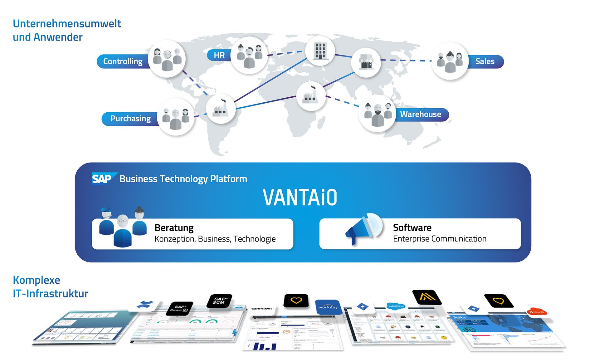 VANTAiO hat sich als Softwarehersteller schon sehr früh mit der cloudbasierten Entwicklungs- und Technologieplattform von SAP beschäftigt und seine eigene, neue Produktgeneration auf dieser Basis entwickelt: News Manager und TV Display sind AddOns für die SAP BTP, die in Unternehmen dafür sorgen, dass relevante Nachrichten bei den gewünschten Zielgruppen auch wirklich ankommen. Gleichzeitig haben sich unsere Berater und Beraterinnen ebenso schnell wie unsere Entwicklerteams auf die neue Cloud-Strategie von SAP eingestellt und individuelle Digitalisierungsprojekte bei Kunden begleitet, beraten und umgesetzt - ausgehend von der Konzeption & User Experience bis hin zur technischen Umsetzung auf Basis der SAP BTP.