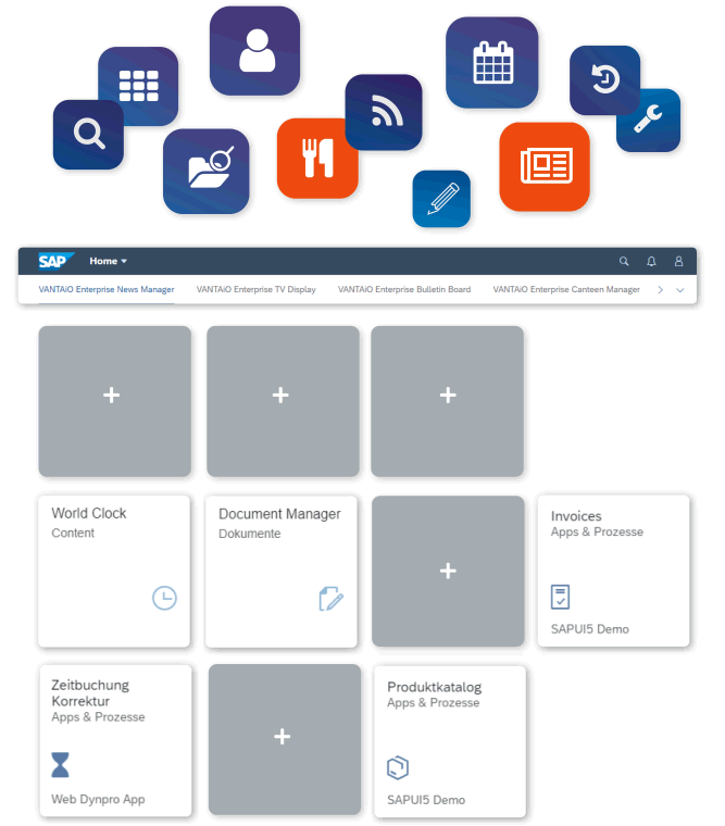 Die SAP-Fiori-User-Experience hat die Arbeitsweise der SAP Anwender in den Unternehmen neu geprägt. Das moderne visuelle Design und Erscheinungsbild sorgt für ein angenehmeres Arbeiten und entspricht auch den Vorstellungen der nächsten Mitarbeitergeneration. Das Fiori Launchpad ist die einfachste Version des Digital Workplace von SAP – mit Fokus auf Applikationen und Prozessen im SAP Standard. Mit den VANTAiO Add-ons und Modulen können auch Inhalte ins SAP Fiori Launchpad gebracht werden, z.B. Nachrichten, Dokumente oder von Mitarbeitern selbst eingestellte Inhalte. Und das sowohl im S/4 HANA Fiori Launchpad als auch im SAP Cloud Platform Fiori Launchpad.
