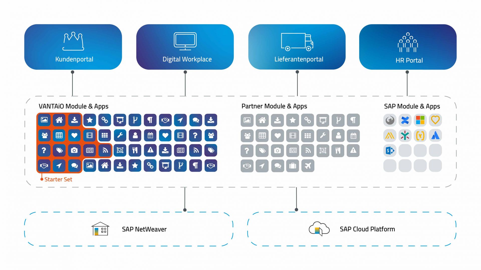 Um die Umsetzung eines HR-Portals möglichst schlank zu halten, bietet sich die Nutzung von Standardsoftware-Bestandteilen an, die aber dennoch individuell anpassbar sind. Wir empfehlen ein Aufsetzen auf einer der zwei großen SAP-Technologien – SAP NetWeaver oder SAP Cloud Platform – und die Erweiterung und Ergänzung durch VANTAiO Portalsoftware. Diese Kombination ist insgesamt sehr variabel und ermöglicht zugleich die ganzheitliche Abdeckung des Themas „HR-Portal“. Da viele der genannten Inhalte und Projektziele bereits im Standard durch VANTAiO Software abgedeckt werden, sparen Sie Zeit und Geld.