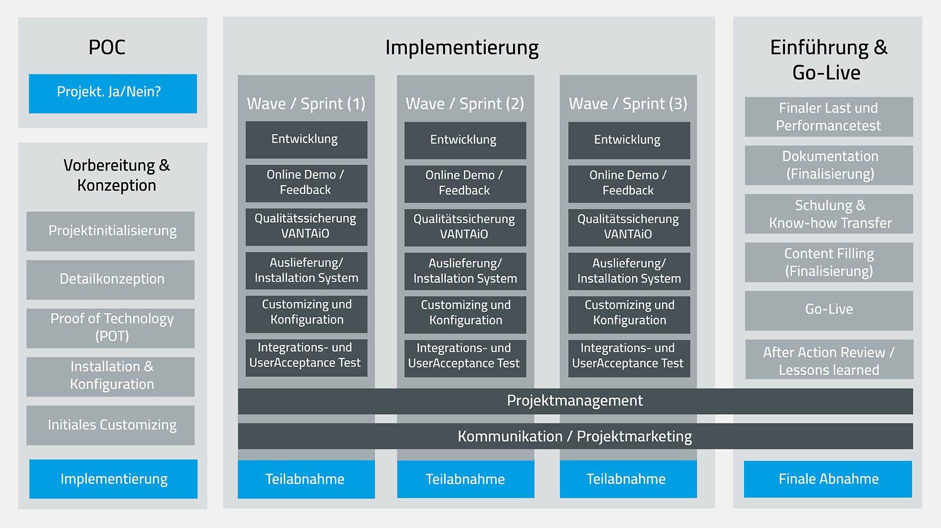 Optionaler Startschuss ist ein Proof of Concept (PoC), mit dem der Nachweis der grundsätzlichen Machbarkeit erbracht wird. In der anschließenden Vorbereitungs- und Konzeptionsphase werden bestehende Interpretationsspielräume noch vor der Entwicklung geklärt und die Funktionalitäten im Detail beschrieben. Auf Basis der verabschiedeten Konzeption erfolgt die Implementierung der Software im Rahmen verschiedener Waves. So entstehen überschaubare, abgeschlossene Entwicklungsstufen, die separat auf den Systemen eingespielt und geprüft werden können. Auch die Durchführung von User Acceptance Tests ist während dieser Waves möglich. Nach Abschluss der Entwicklung wird das System eingeführt – natürlich nicht, ohne Performance und Laststabilität final zu prüfen. Die notwendigen Schulungen finden statt, Dokumentationen werden fertigstellt und das Portal mit Content befüllt (die Content-Befüllung kann auf Wunsch auch bereits in einem früheren Projektstadium erfolgen). Dann heißt es: „Go live!“